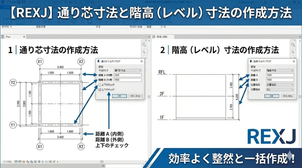 【REXJ】通り芯寸法と階高(レベル)寸法の作成方法